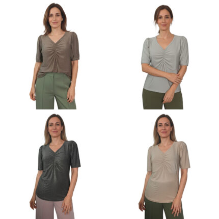 Original price was: $ 25.000.$ 22.490Current price is: $ 22.490. WhatsApp 10% OFFBlusa Lurex Brillante Mangas Cortas Frunce Al Frente